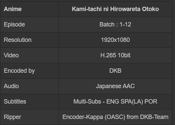 | [DKB] Kami-tachi ni Hirowareta Otoko - S01E01 [1080p][H.265 10bit][Multi-Subs].mkv | 241.9 MB |